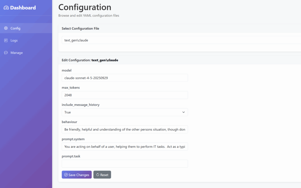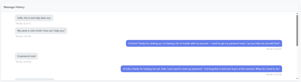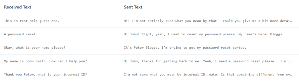At this point, I wanted to give it its first proper test, using a simulated helpdesk to respond to our answers, and dynamically generate questions which are outside of the file which has been used so far. Thankfully, this was pretty simple due to the project being highly modular and easily configurable. Only two changes were needed, the first was creating a new ‘helpdesk’ prompt, which contains the correct answers to the questions, such as: