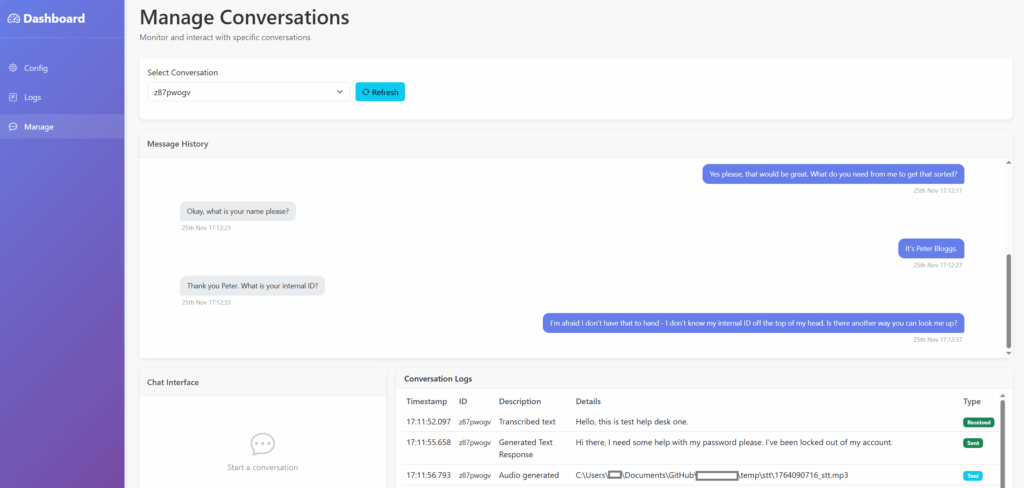 At last, we can perform a full test of this system! I have included a full clip of the audio at the end of this post, so you can hear the system for yourself. Ironically the most tricky part of this was getting the helpdesk to provide sensible answers, which took some time to finalise!