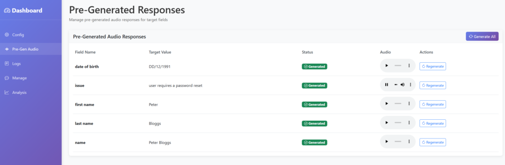 Another basic thing to implement was pre-generation of audio content, taking the items we defined in our configuration about the target, such as dates of birth and addresses, then generating typical audio responses if we are prompted for it.